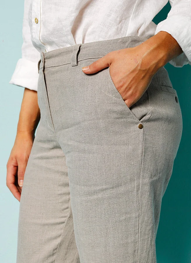 Linnebyxa i en avslappnad och bekväm chinos-modell. Sköna fickor i sidorna, linning med hällor och diskreta bakfickor.