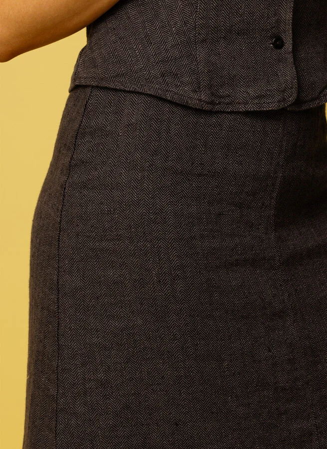 Lätt a-formad linnekjol med dekorativ söm mitt fram och bak i fiskbensvävt lin.