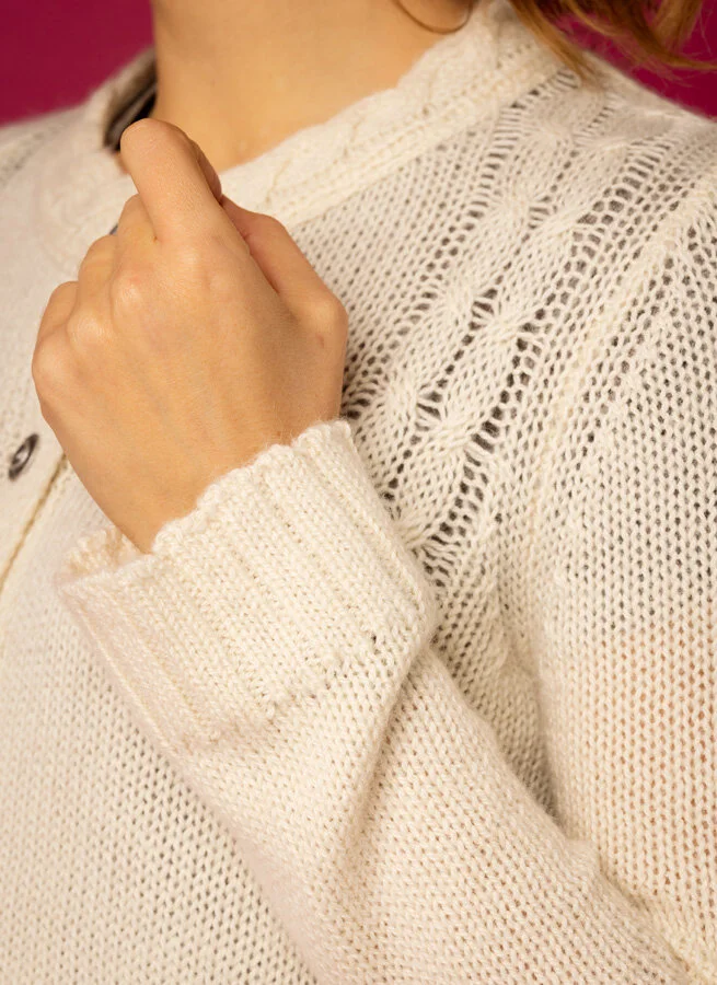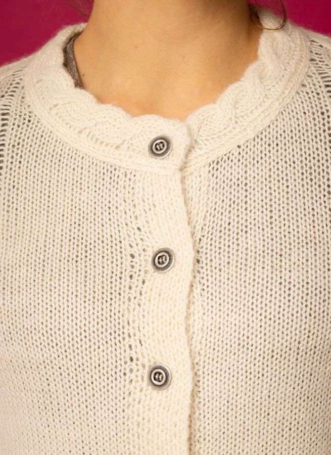 Rak ullkofta med flätstickade detaljer. Knappar i metall.