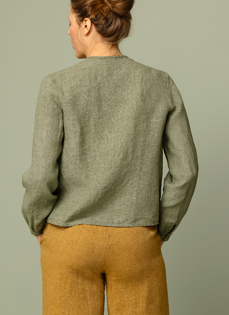Grönmelerad linneblus med lagda veck framtill. Rynkat ärmslut med smal manschett.