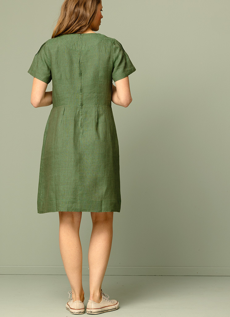 Knälång linneklänning med stråvecksdetaljer och blixtlås bak.