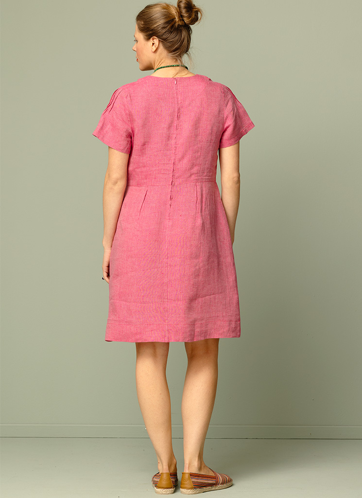 Knälång linneklänning med stråvecksdetaljer och blixtlås bak.