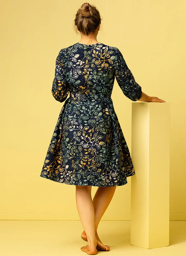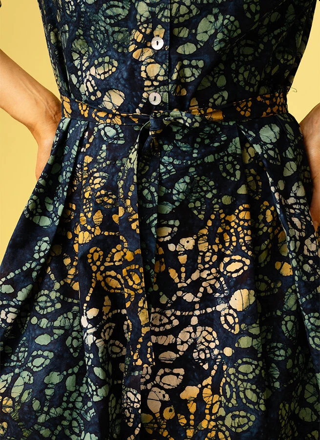 V-ringad batikmönstrad klänning med vippig nederdel. Klänningen har avtagbar knytband i midjan och knappar framtill och på ärmslutet.
