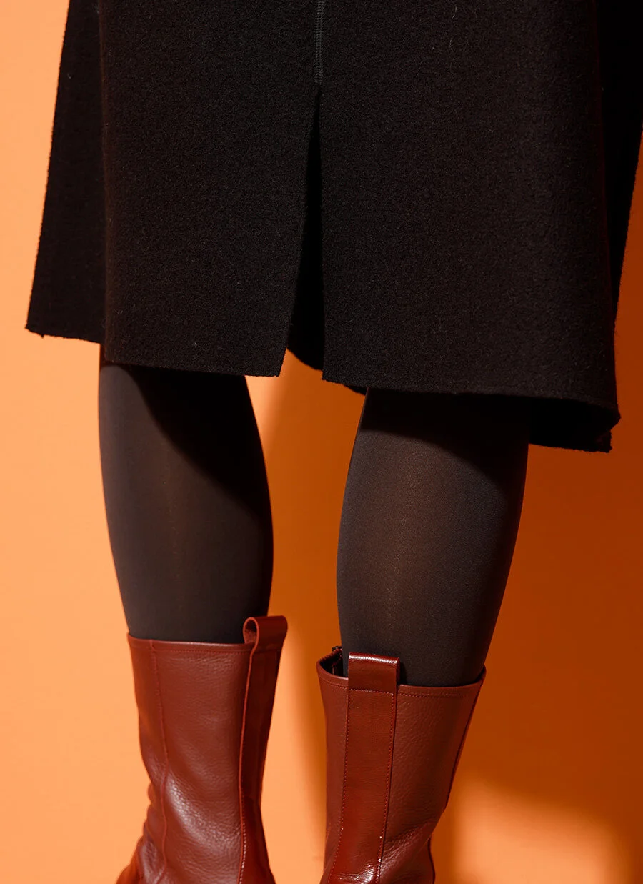 Svart A-linjeformad, längre kjol i kokad ull. Kjolen är fodrad upptill med viskos, har blixtlås i sidan och sprund bak.