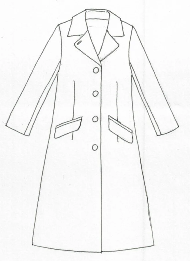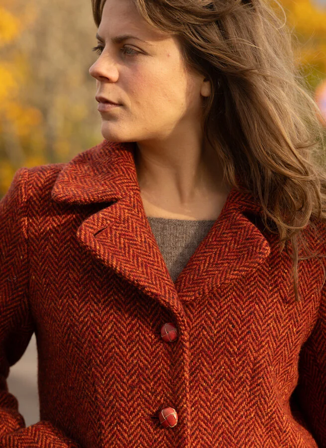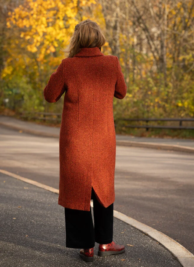 Röd lång kappa i fiskbensmönstrad ull fodrad med tunn viskos. Kappan har klassiskt slag, flätade skinnknappar och fickor fram.
