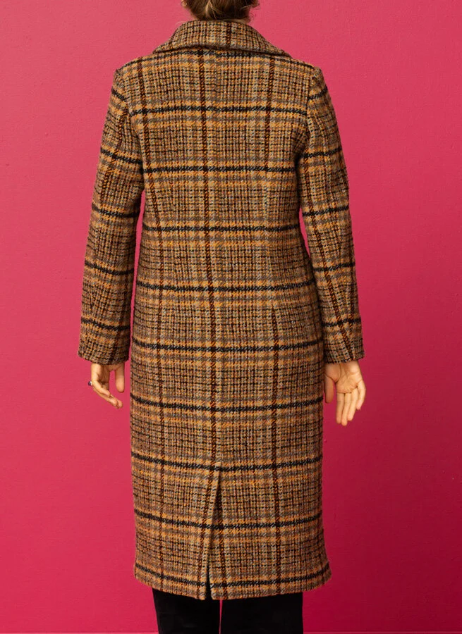 Rutig lång ullkappa i orange och blå toner. Kappan har klassiskt slag, skinnknappar och fickor fram.