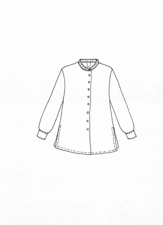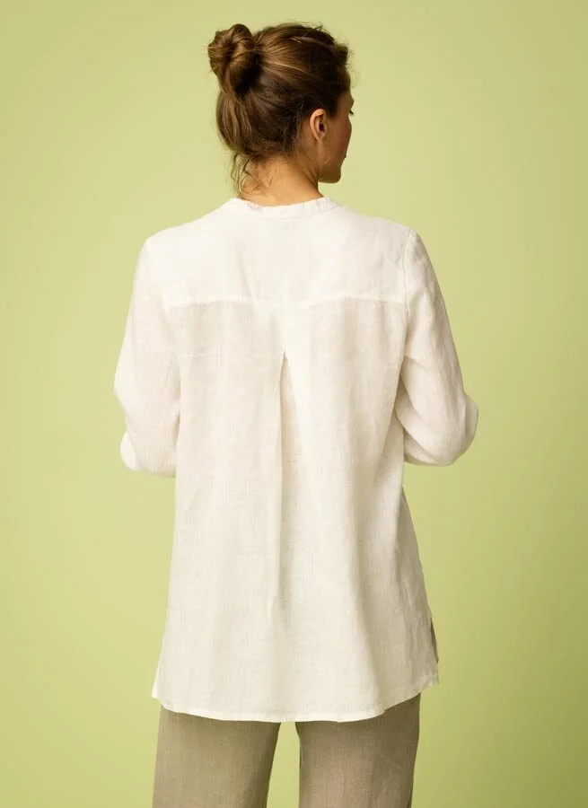 Tunn, långärmad linneblus med murarkrage. Motveck bak ger fin vidd.