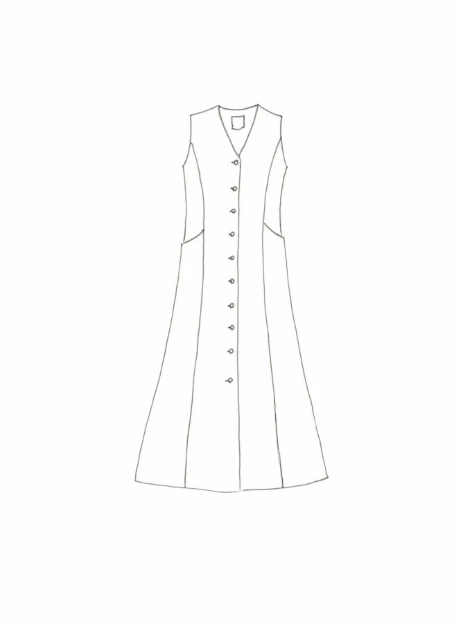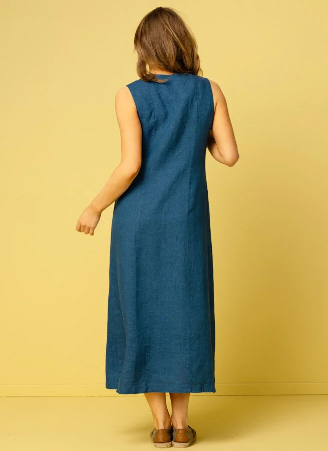Lång blå linneklänning med knäppning hela vägen fram. Fickor i sidorna.