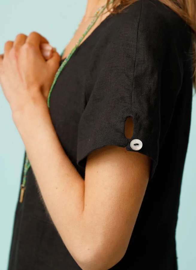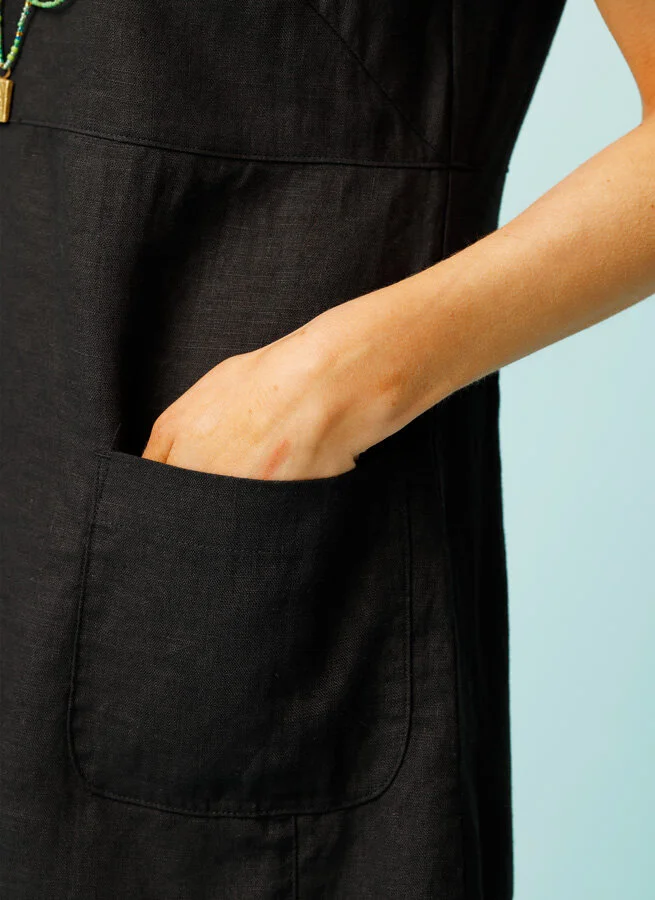 Klänningen består av 100% vävt lin, ett fantastiskt naturligt och miljövänligt material som låter din kropp andas. Linet har också en vacker lyster och oregelbundenhet i sin väv och blir bara vackrare och vackrare med tiden. Plagget har förtvättats och därigenom också förkrympts.