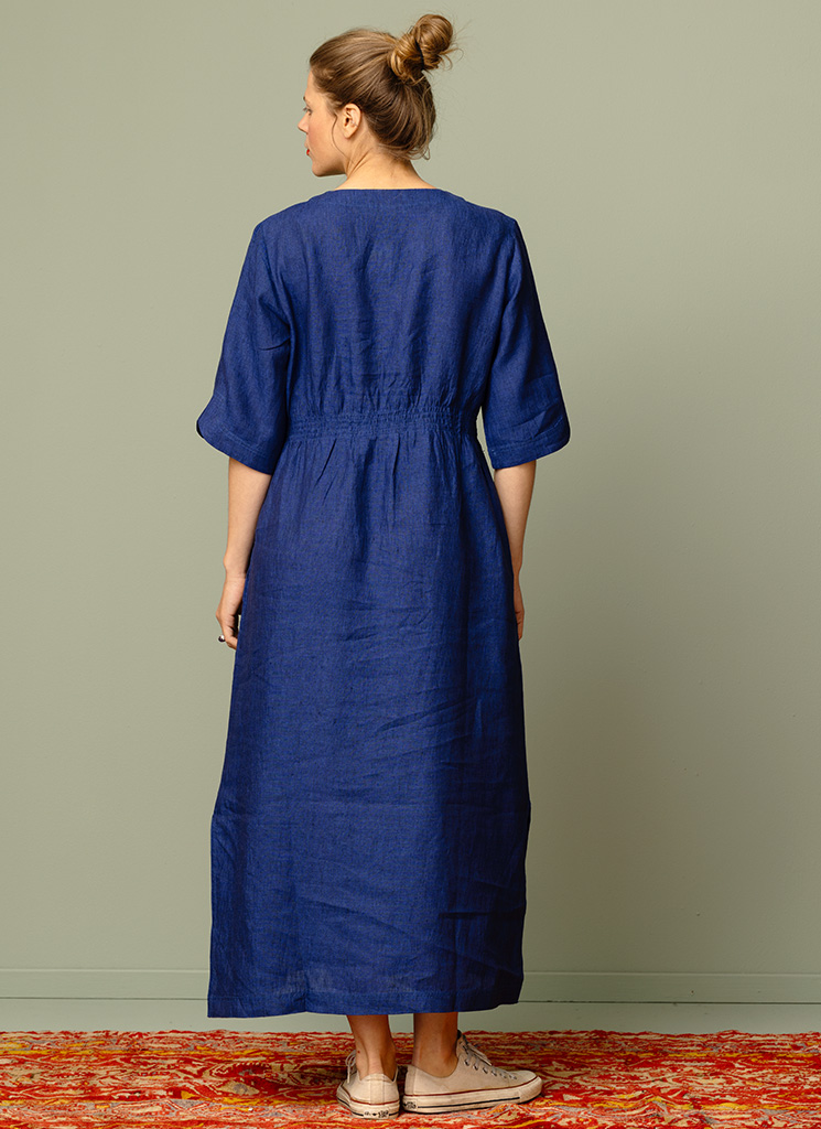 V-ringad linneklänning i melerat lin med vacker lyster. Klänningen har trekvartsärm med liten slits. Lös, bred resår i midjan. Slitsar i sidorna.