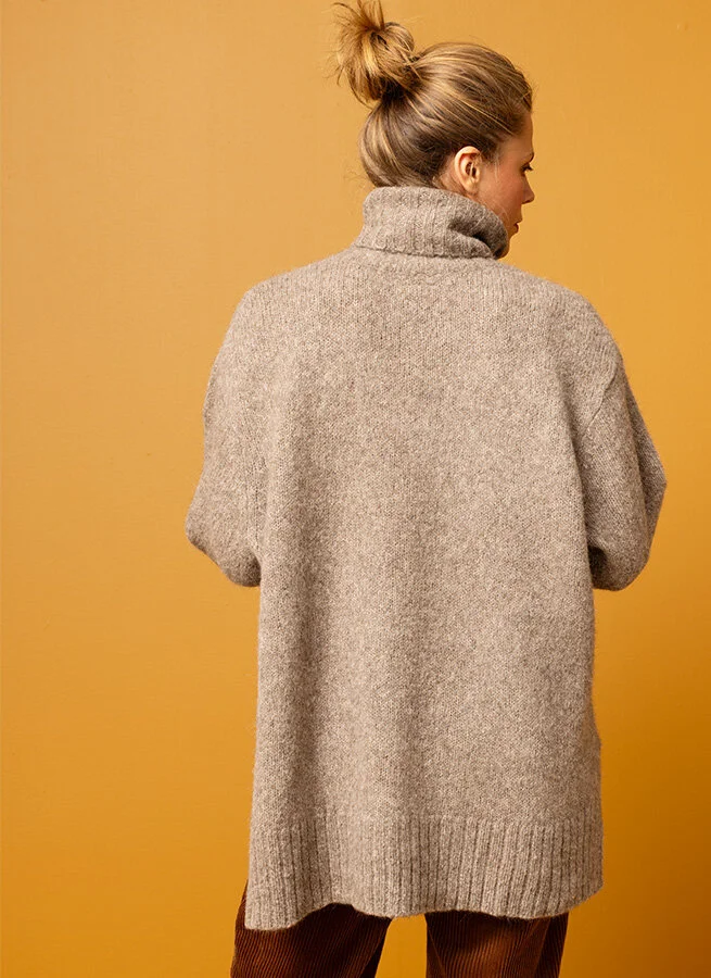 Stickad oversized polotröja i en härlig ullblandning. En ulltröja med längre bakstycke och ribb på krage, ärmslut och nedtill.