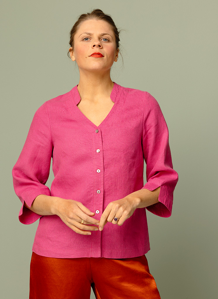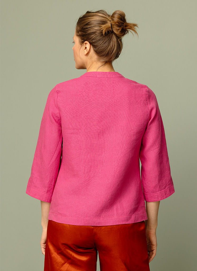Rosa linneblus med dekorativ krage och trekvartsärm.