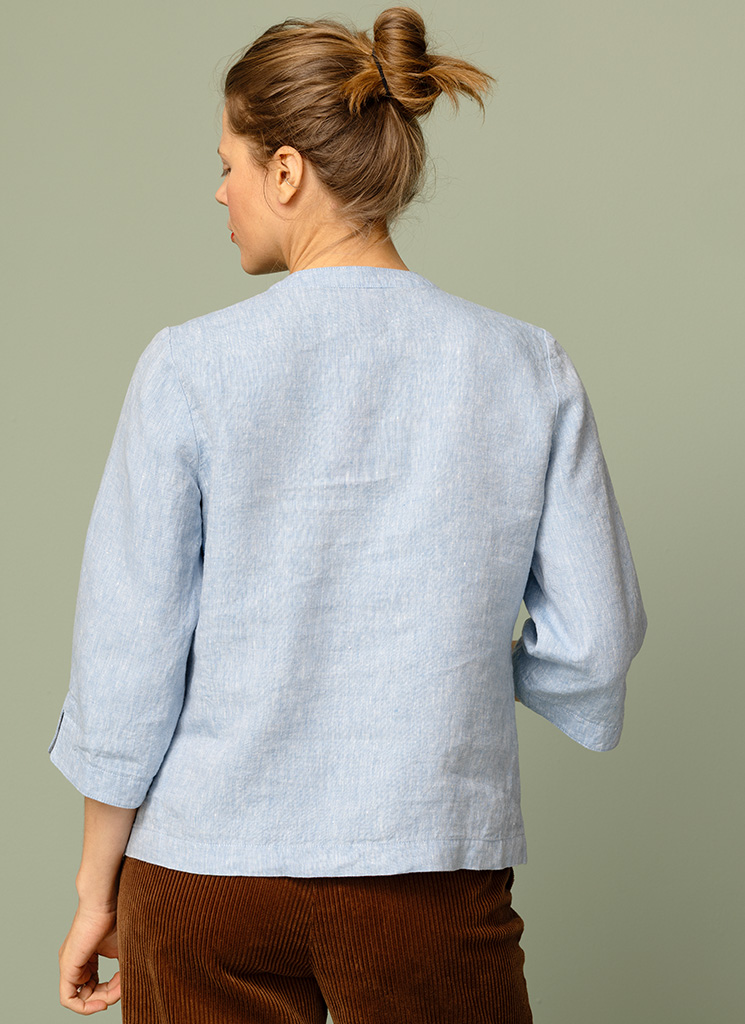 V-ringad blåmelerad linneblus med liten dekorativ krage och trekvartsärm.