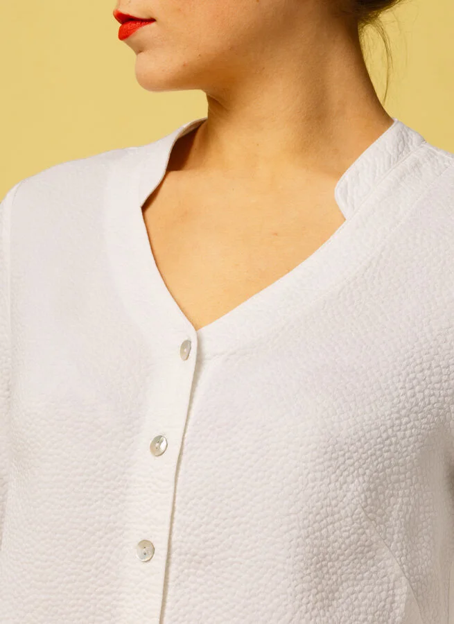V-ringad vit linneblus med tunn smickrande ståkrage. Trekvartsärm med liten slits.