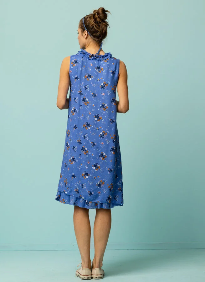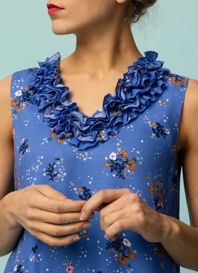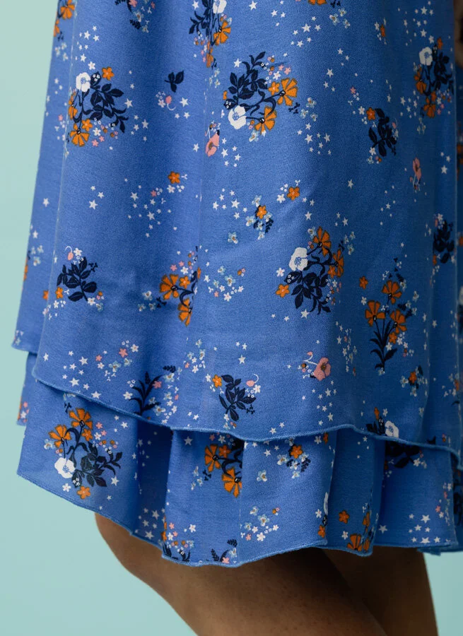 V-ringad blåmönstrad viskosklänning med krås och asymmetrisk skärning i dubbla lager tyg.