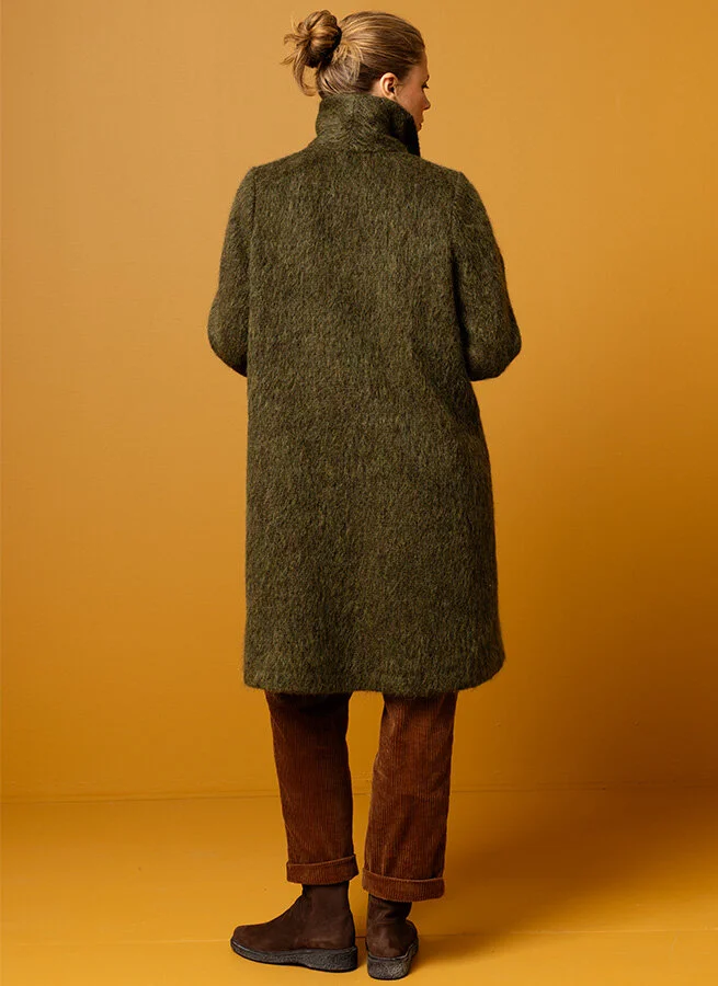 Underbart fluffig ullkappa, aningen A-linjeformad. Kappan har snedställda fickor fram, bruna skinnknappar och är fodrad med tunn viskos.