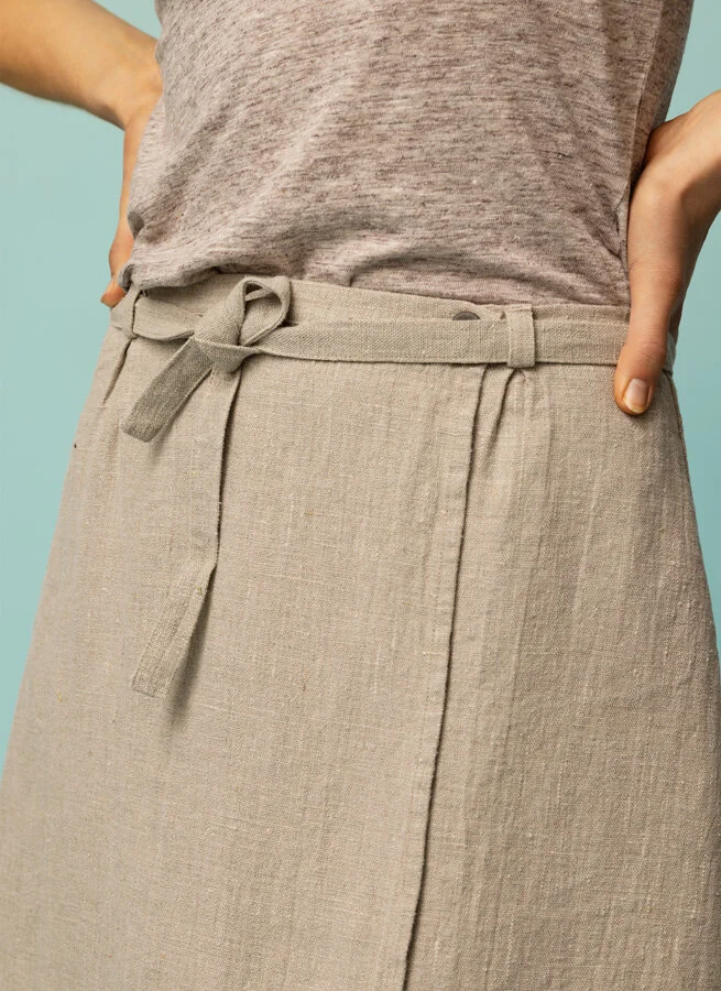 Kort linnekjol i omlott med knapp och knytband i midjan.