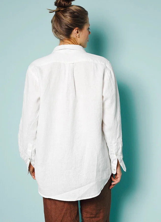 Oversized rymlig damskjorta i herrmodell. Klassisk generös vit linneskjorta.