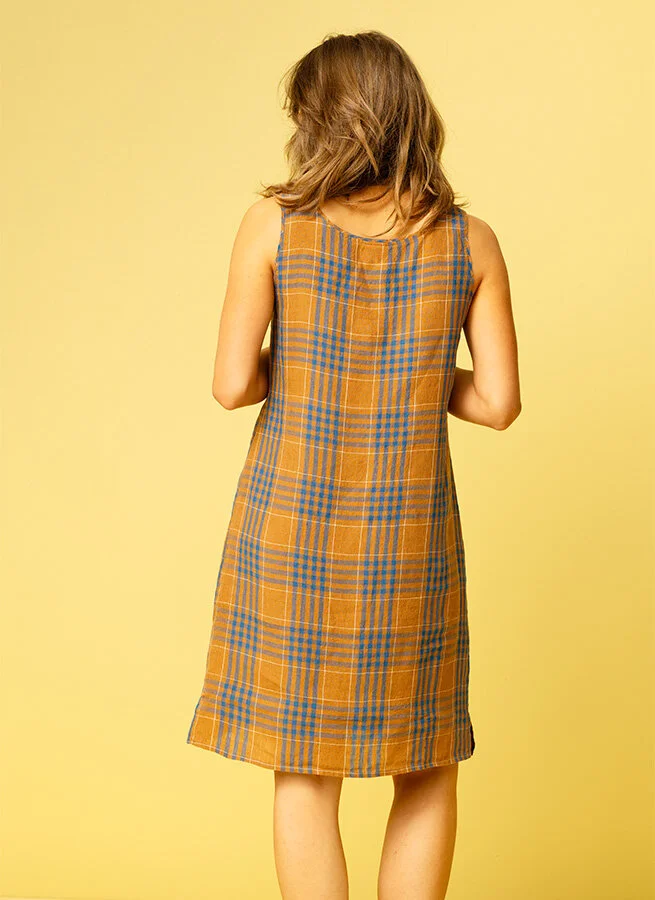 Rutig ärmlös linneklänning eller tunika med skön rymd. En vid klänning utan blixtlås som är lätt att bara dra på.
