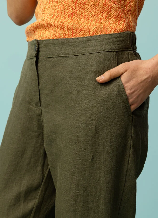 Smal linnebyxa med fickor i sidorna och resår bak för bästa passform.