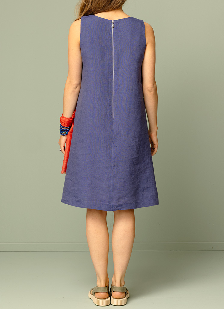 Blå ärmlös midiklänning med stora utanpåfickor. Blixtlås bak.