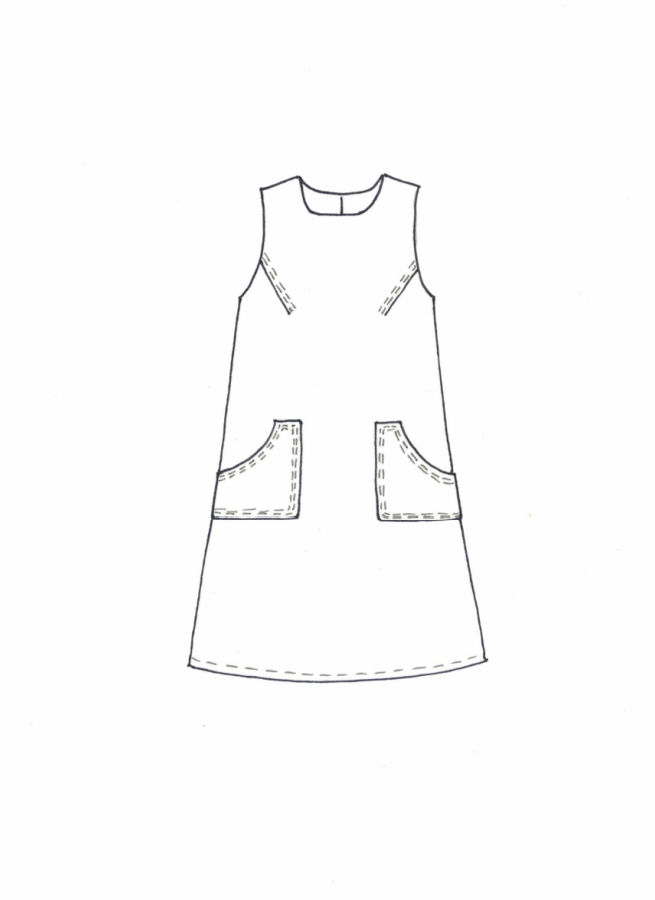 Svartmönstrad ärmlös midiklänning med stora utanpåfickor. Blixtlås bak.