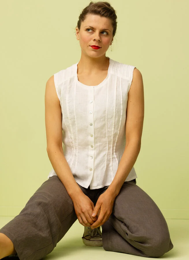 Höghalsat linne i fin form med dekorativa veck och pärlemorknappar fram.