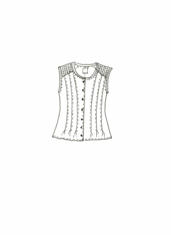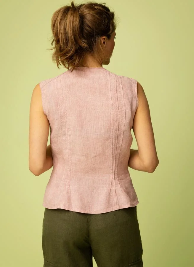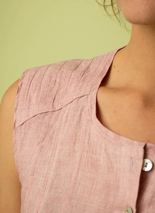 Höghalsat linne i fin form med dekorativa veck och pärlemorknappar fram.