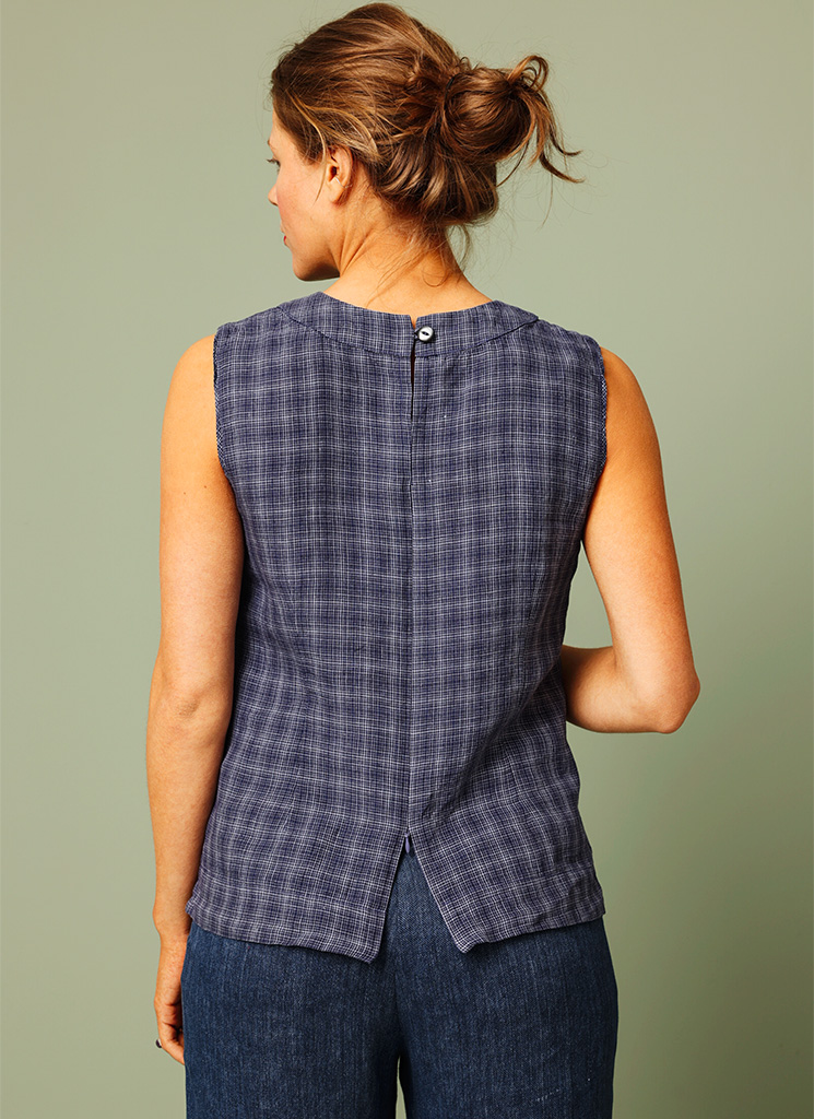 Blått linne med hög halsringning och små slitsar i sidorna. Blixtlås bak samt liten öppning med knapp.