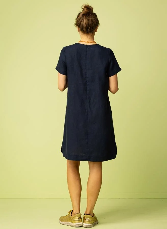 Rak, kortärmad linneklänning med rundad nederdel, fickor i sidorna och blixtlås bak.