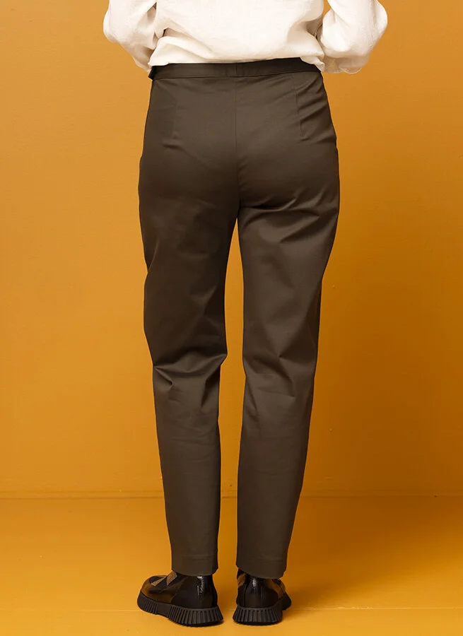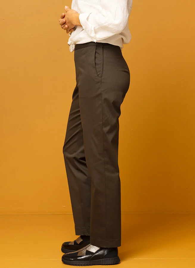 Byxan är tillverkad i 51% bomull, 46% viskos och 4% elastan för skön stretch. Plagget är förtvättat och därmed förkrympt.