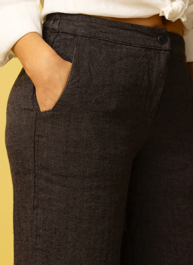 Scarlett är en svartgrå, lite kortare fiskbensvävd linnebyxa med vidd nedtill. Den bekväma byxan har resår baktill och fickor i sidorna.