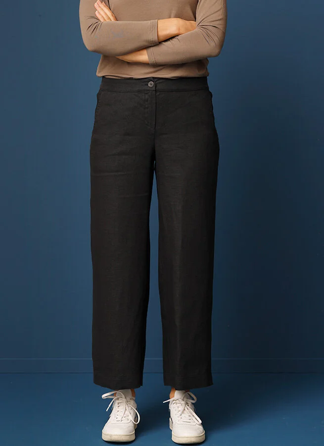 Scarlett är en lite kortare linnebyxa med vidd nedtill. Den bekväma byxan har resår baktill och fickor i sidorna.