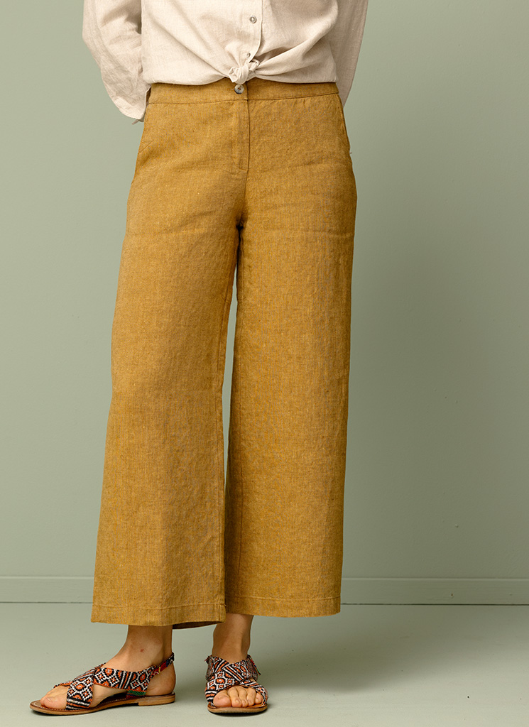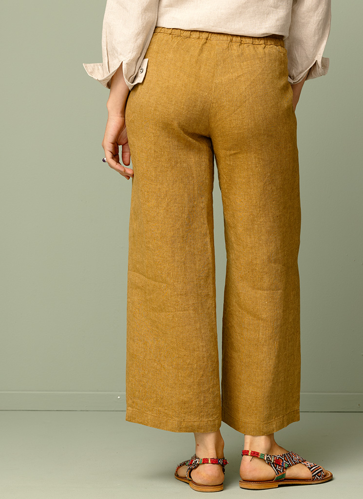 En lite kortare linnebyxa i vacker brungul nyans. Den bekväma byxan har resår baktill och fickor i sidorna.
