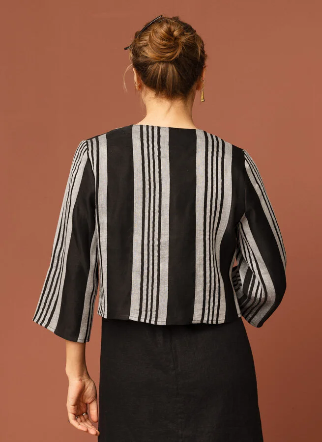 V-ringad kort jacka med känsla av bolero, perfekt att bära över en bararmad klänning! Jackan har svart botten med gråskimrande ränder.