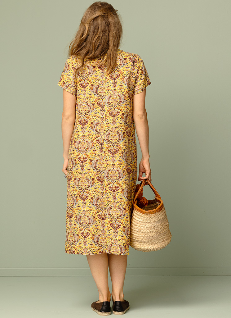 Gulmönstrad midiklänning med holkärm och blixtlås framtill. Fickor i sidorna.