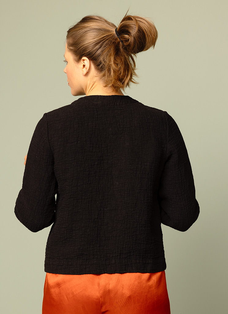 Svart kraglös jacka med bubblig struktur. En rak, lite kortare linnejacka med kortare trekvartsärm.