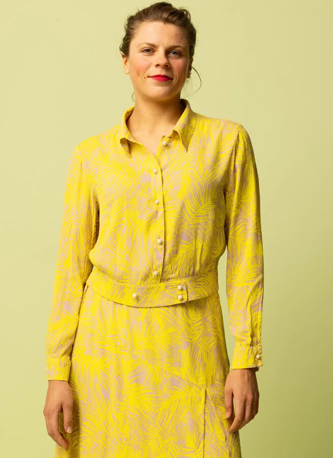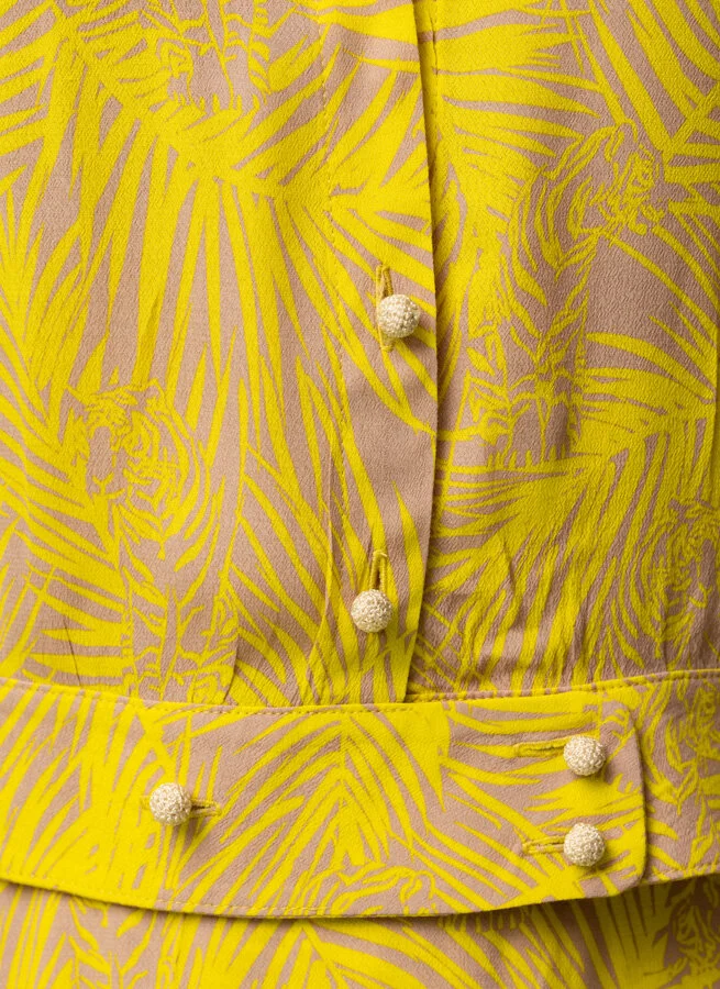 Gulmönstrad kort blus i mönstrad tunn, aningen transparent viskos.
