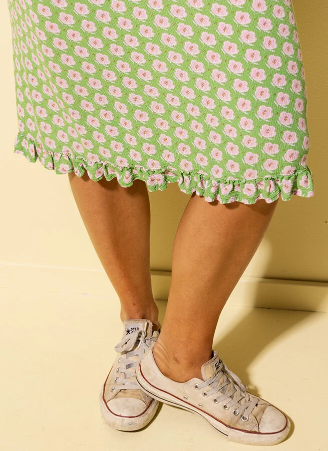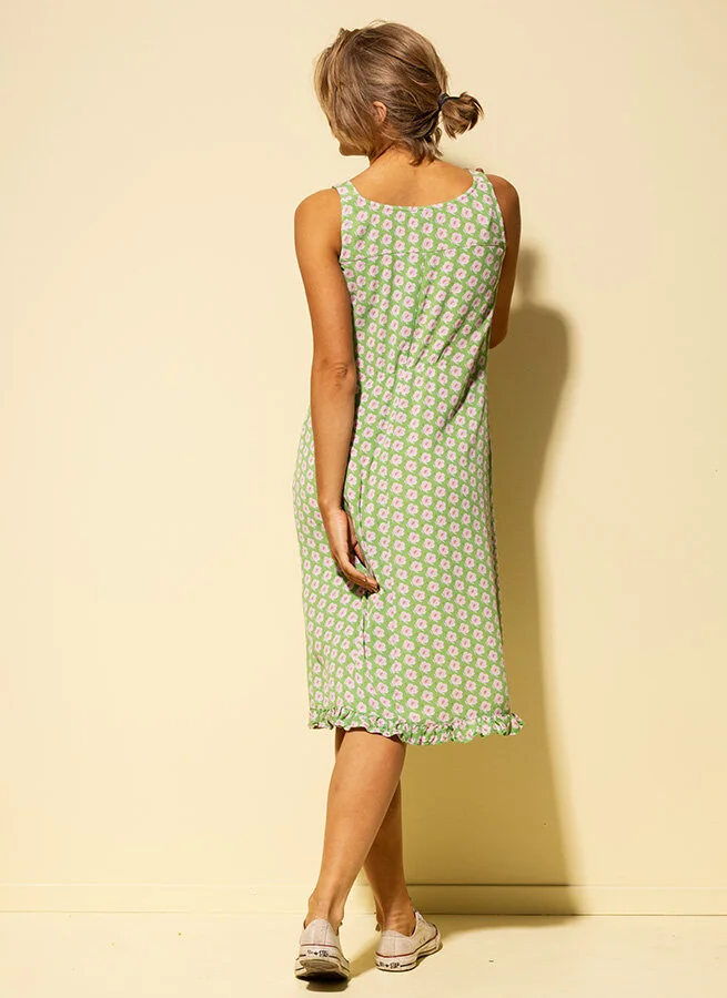 Ärmlös klänning med axelband och liten volang nedtill. En mönstrad klänning med grön botten och rosa blommor på.