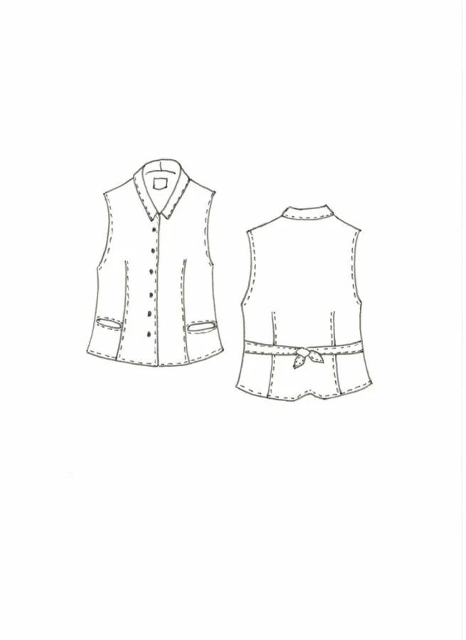Gråsvart fiskbensvävd linneväst med liten krage, fickor fram och knytband i ryggen.