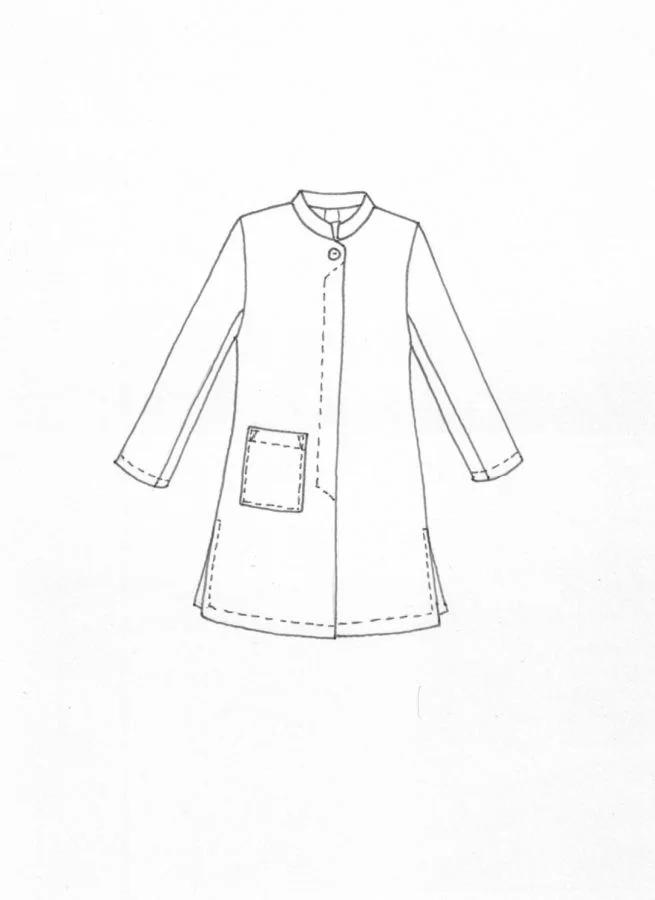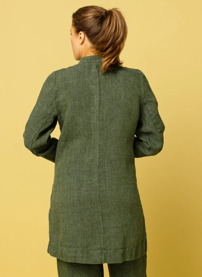 Lång grön linnejacka med liten skorstenskrage och dold knäppning. Endast den översta knappen är synlig. En ficka fram och slitsar i sidorna.