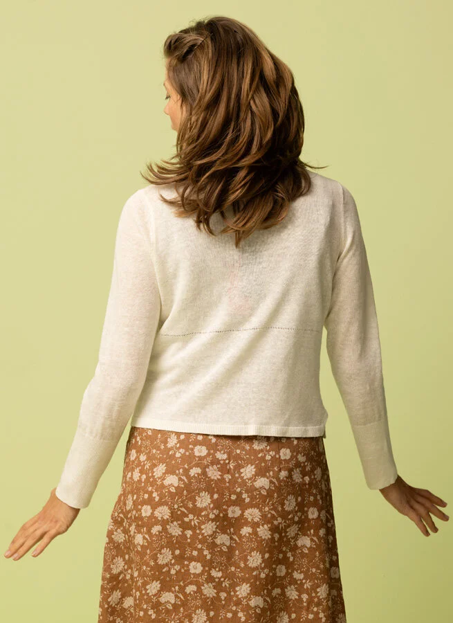V-ringad kort linnekofta med hålmönster och bred ribb på ärmslutet. Liten slits på sidorna.