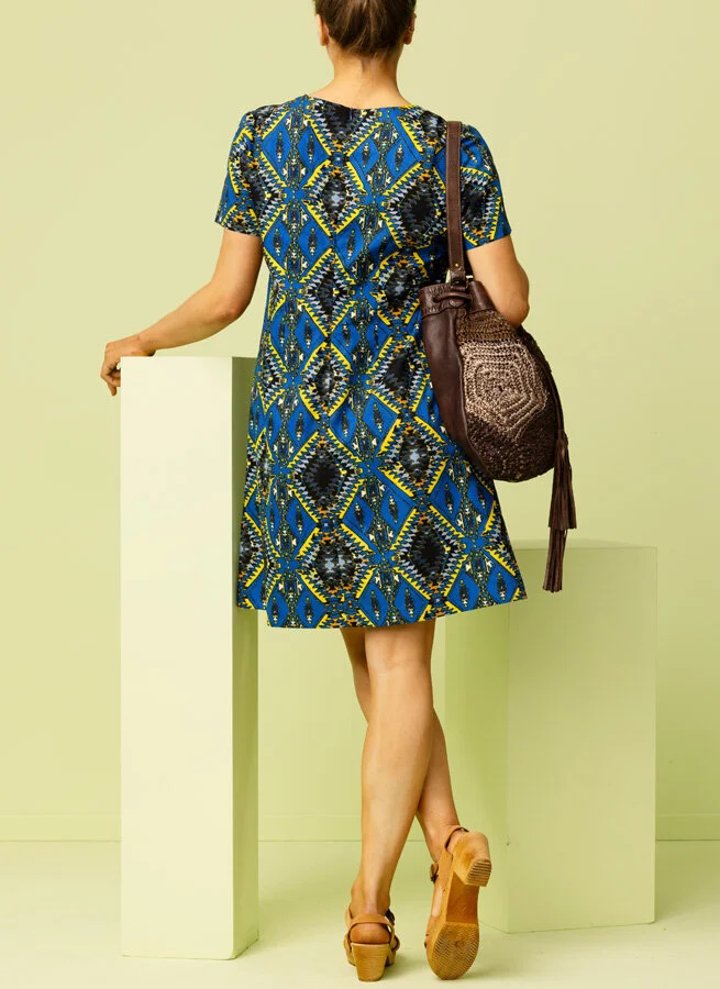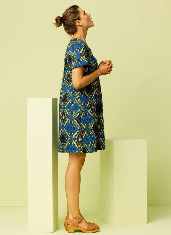 Kortärmad gulmönstrad klänning med klarblå botten.