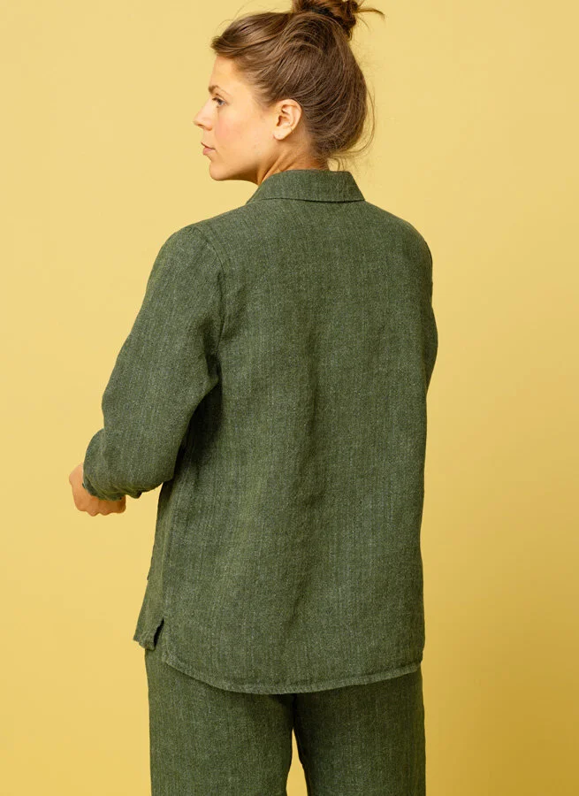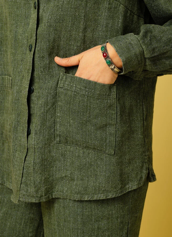Ledig grön linneskjorta i grov kvalité med utanpåfickor fram och små slitsar i sidorna.