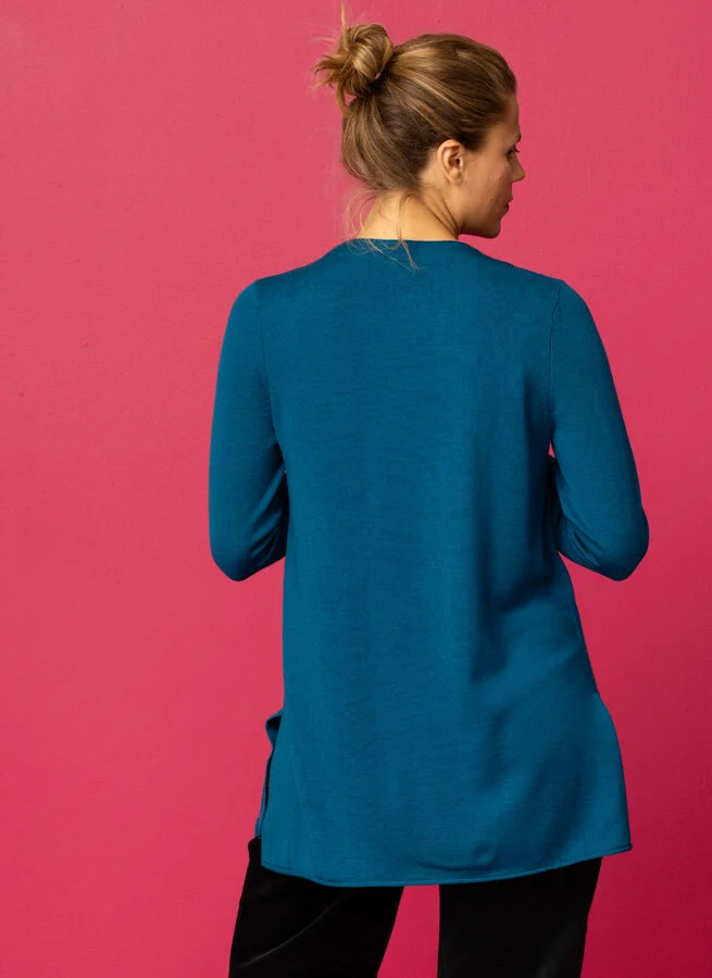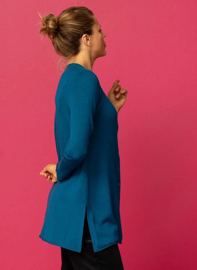Lång slätstickad kofta i skön merinoull, V-ringad och med små slitsar i sidorna.