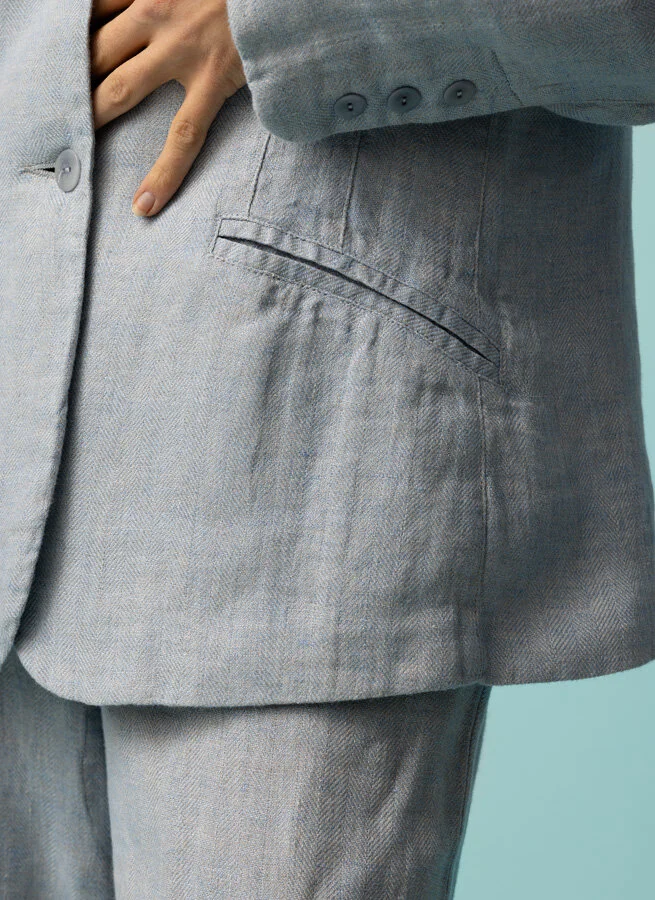 Klassisk ljusblå fiskbensmönstrad linnekavaj, fodrad med tunt lin. En tidlös sommarkavaj att bära år efter år.