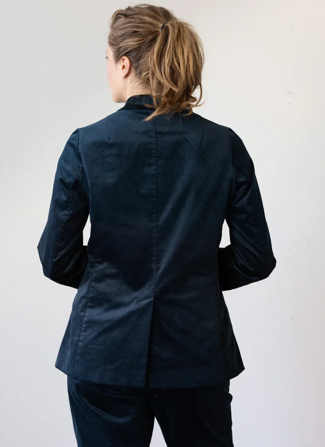 Kavajen är tillverkad i en skönt stretchig sammetskvalité med 76% ekologisk BCI (Better cotton initiative) bomull. Tillverkningen sker hos ett litet familjeföretag i Litauen som vi arbetat med sedan många år tillbaka. Tyget kommer från Spanien.
