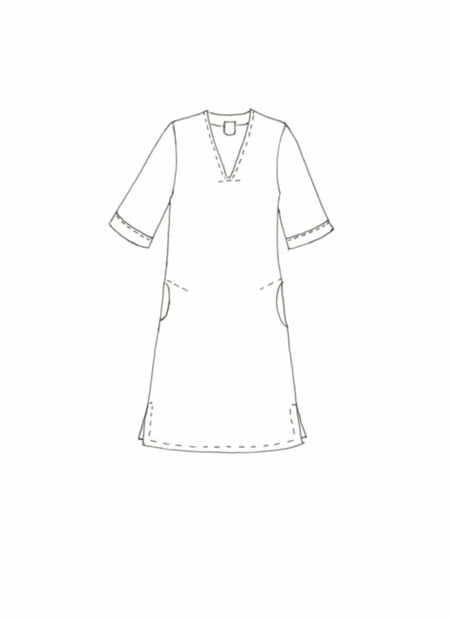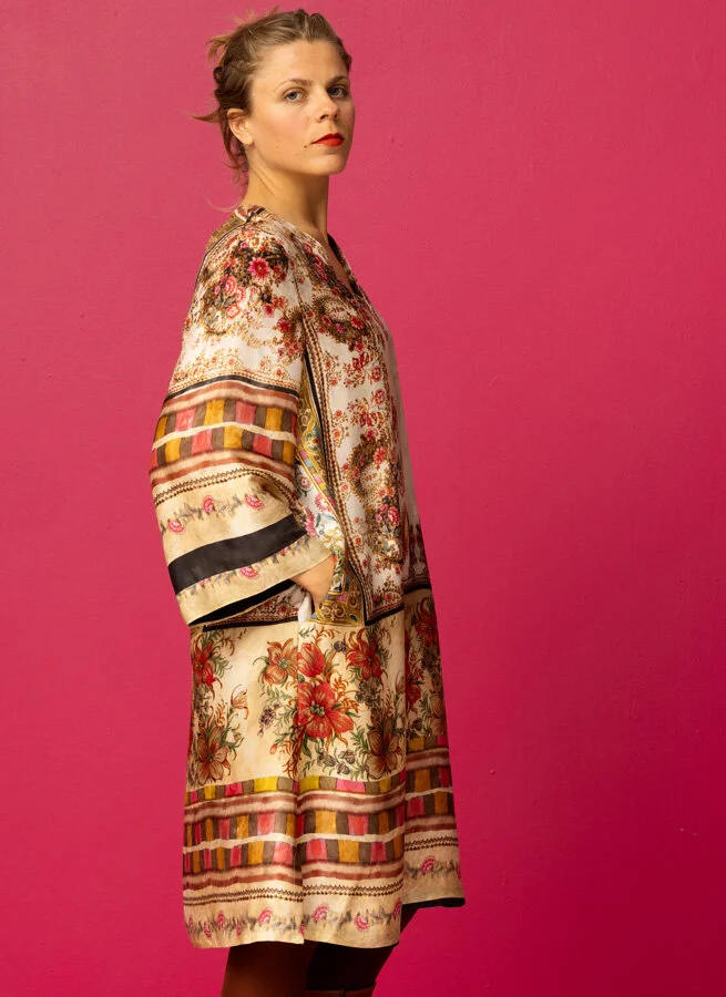 Kaftanliknande klänning i mönstrad viskos. V-ringning, fickor och slitsar i sidorna.